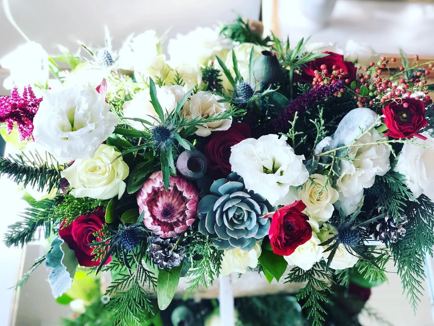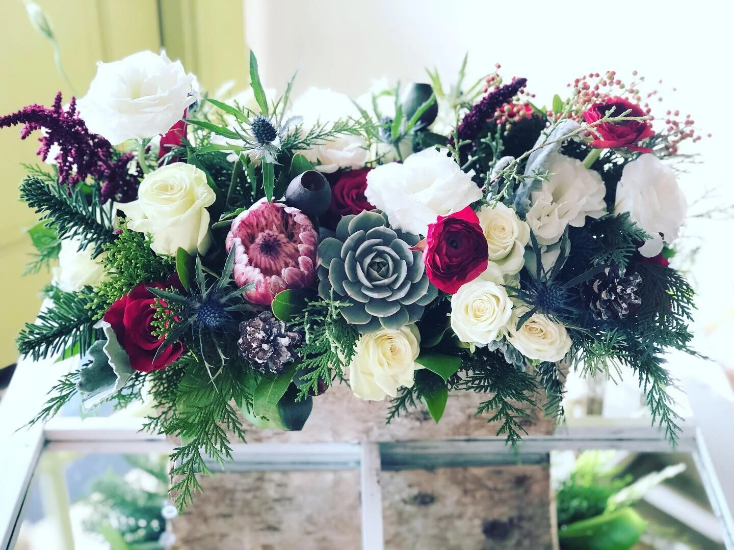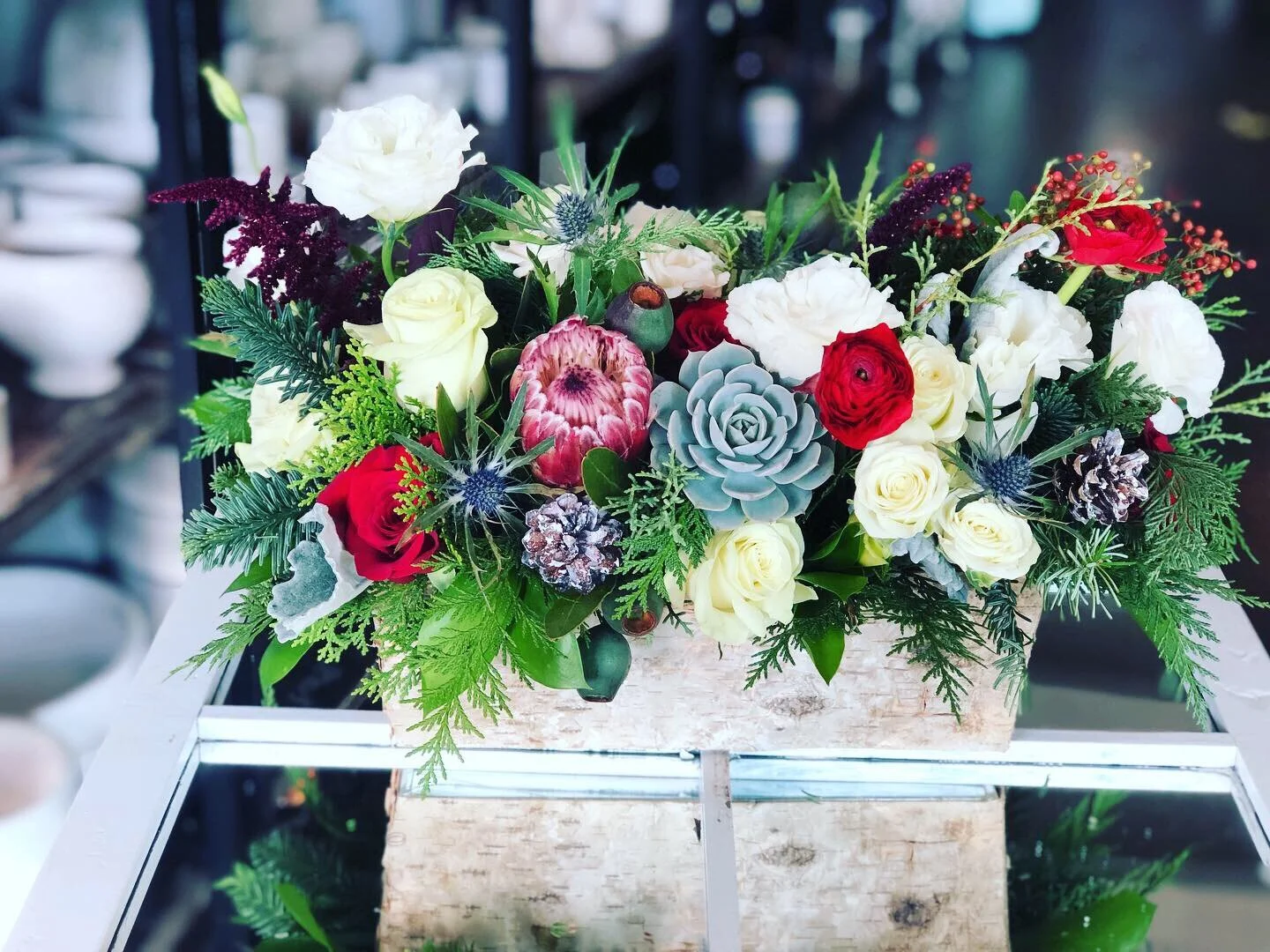 Our Red, white holiday arrangement is completed with beautiful protea, anemone, ranunculus and succulents in a birch box. ( will be substituted with white ceramic or wood box)